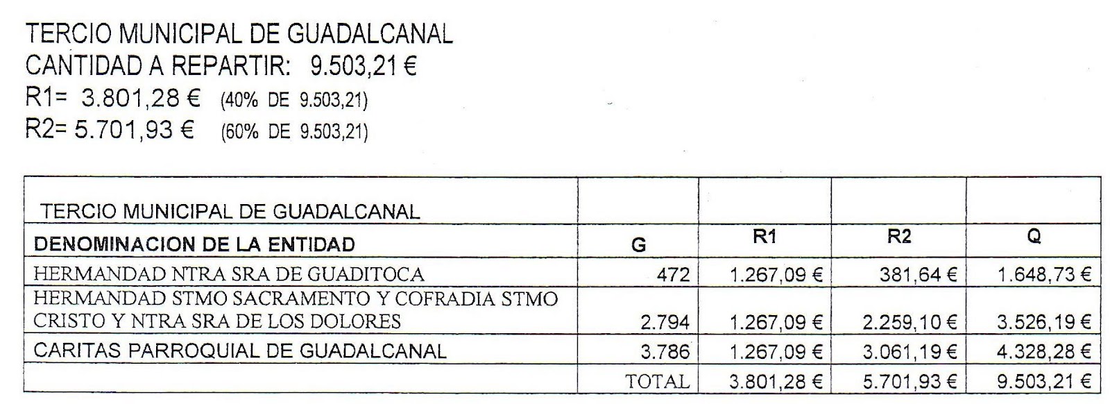 Felicitamos a la Hermandad de Nuestra Señora de Guaditoca, a la del Santísimo Cristo de las Aguas y a Cáritas Parroquial de Guadalcanal, que han sido designadas como partícipe en el reparto del importe asignado para Guadalcanal.